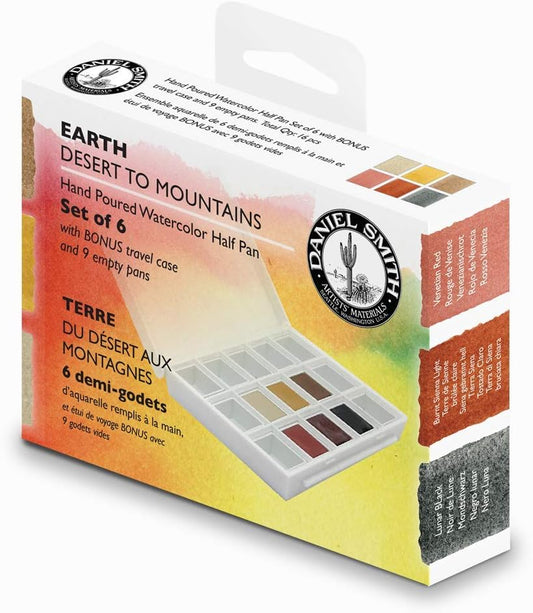 DANIEL SMITH Hand Poured Watercolor, Half Pans, Earth Set with 6 Watercolor Half Pans, 9 Empty Half Pans, 1 Plastic Travel Case (Total 16 Pieces) 285650002